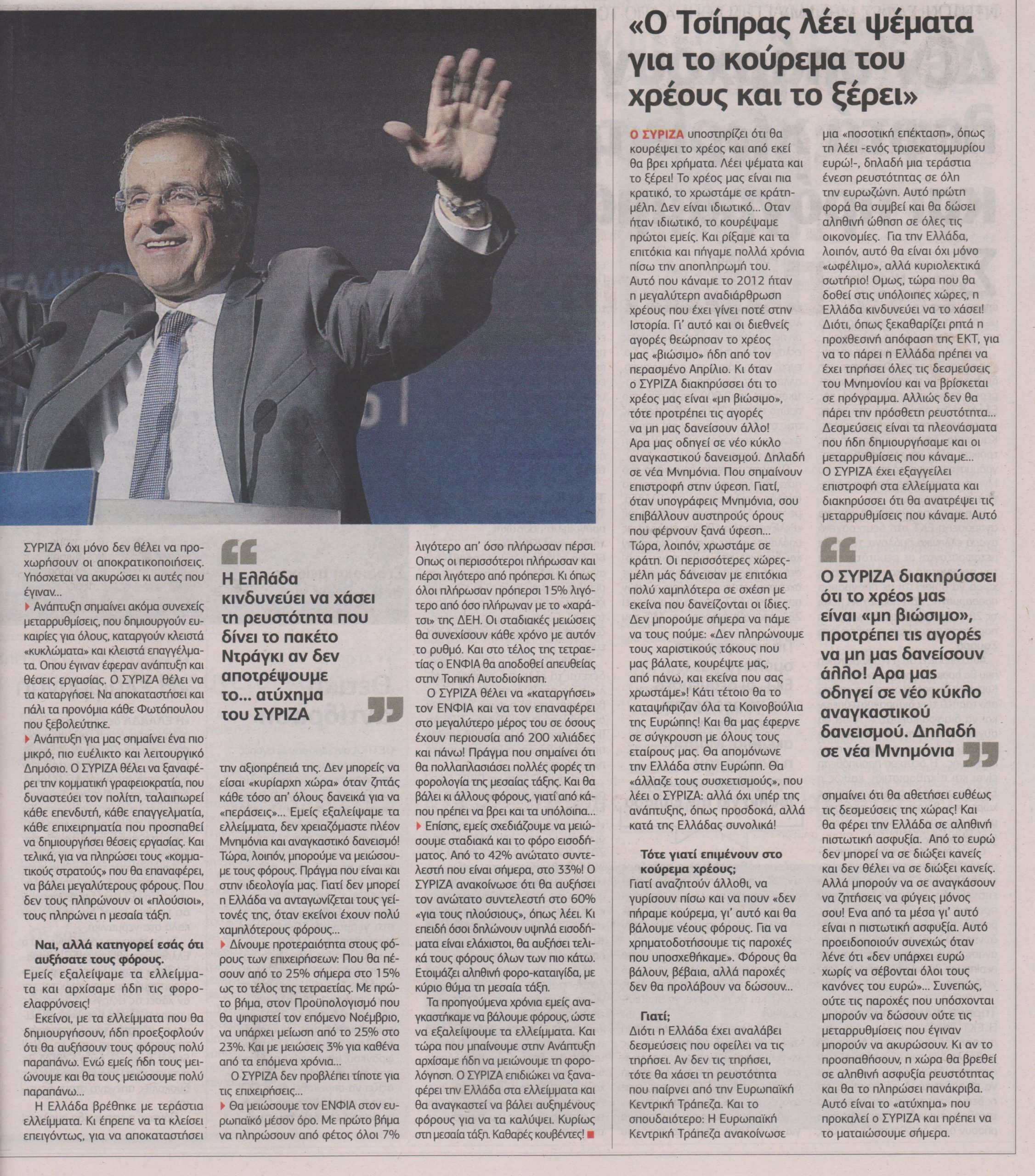 «Ο Τσίπρας λέει ψέματα για το κούρεμα του χρέους και το ξέρει. Ο ΣΥΡΙΖΑ διακηρύσσει ότι το χρέος μας είναι μη βιώσιμο, προτρέπει τις αγορές να μη μας δανείσουν άλλο. Άρα μας οδηγεί σε νέο κύκλο αναγκαστικού δανεισμού. Δηλαδή σε νέα Μνημόνια», πρόσθεσε.