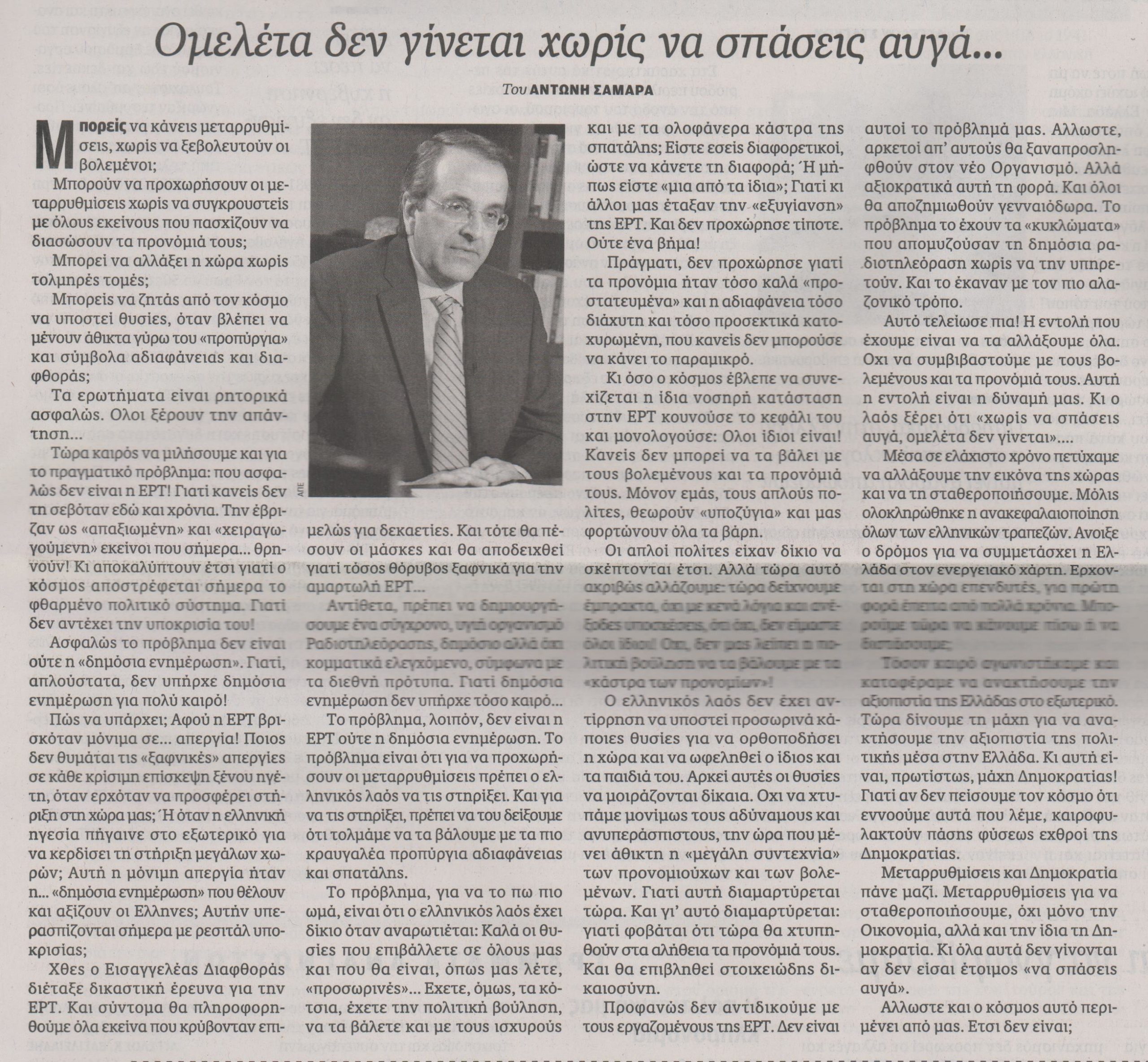 Σαμαράς: Ομελέτα δεν γίνεται χωρίς να σπάσεις αυγά…