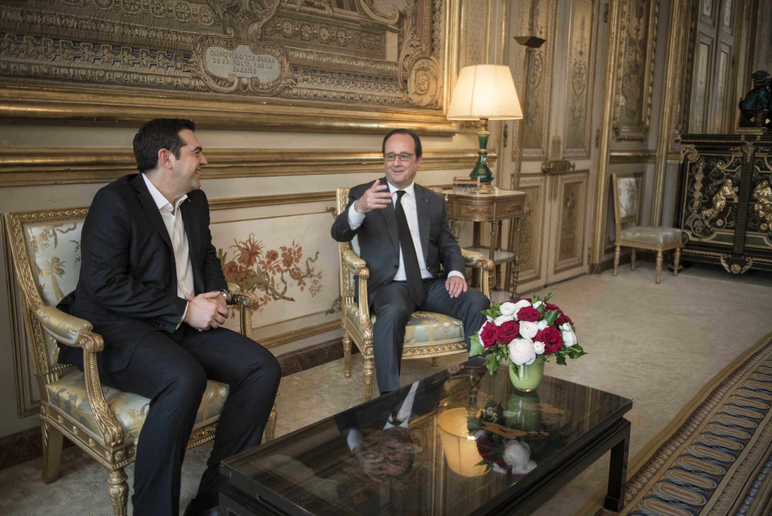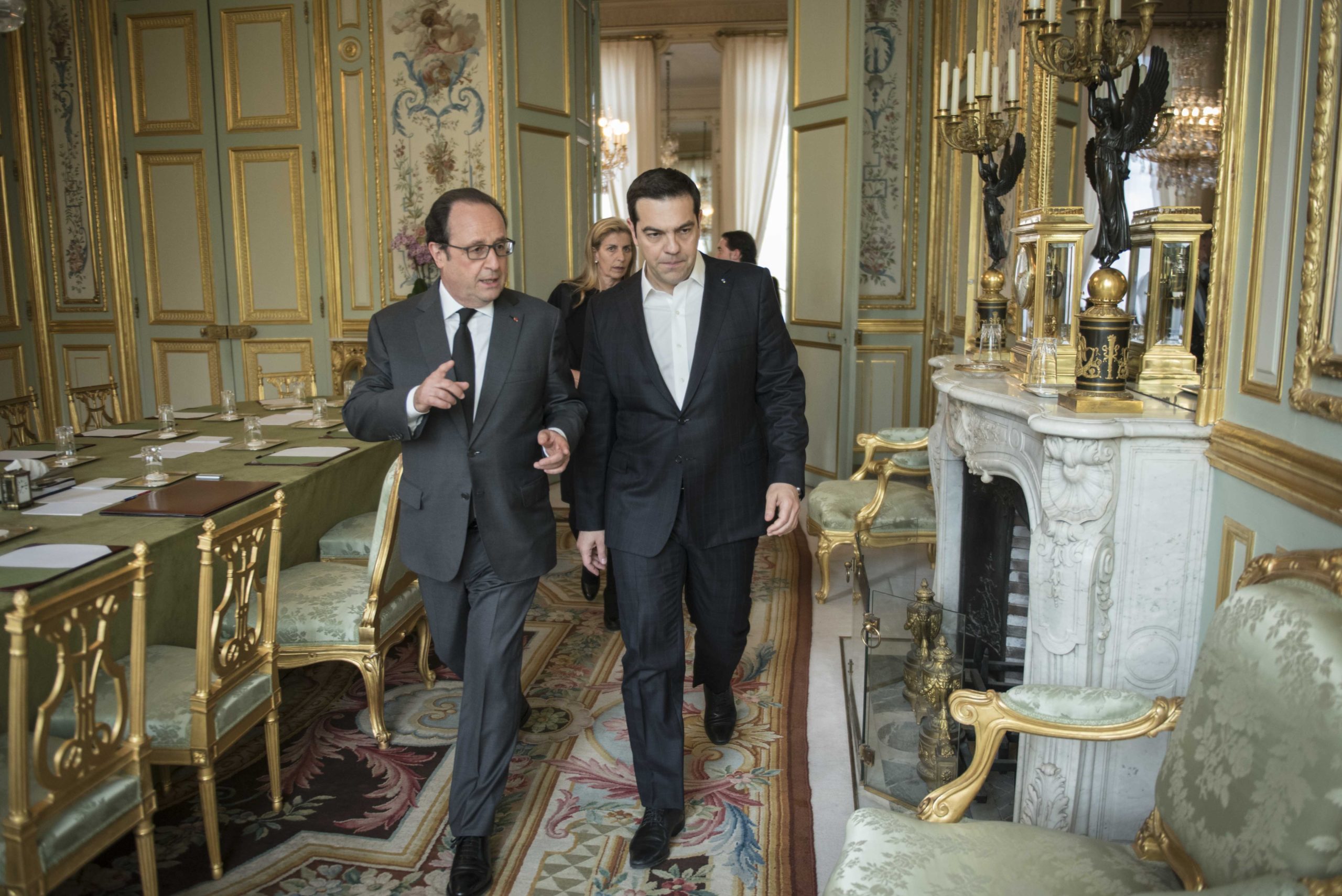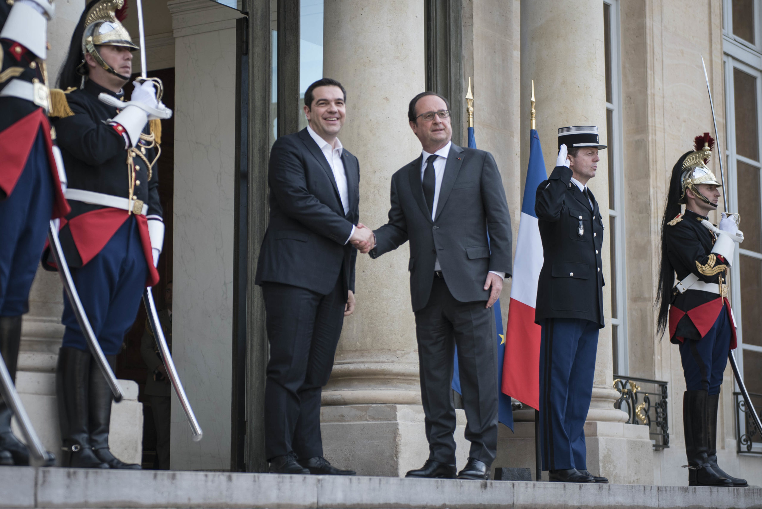 Σε εξέλιξη βρίσκεται η συνάντηση του Πρωθυπουργού, Αλέξη Τσίπρα με τον Πρόεδρο της Γαλλίας, Φρανσουά Ολάντ, στο Μέγαρο των Ηλυσίων Πεδίων.