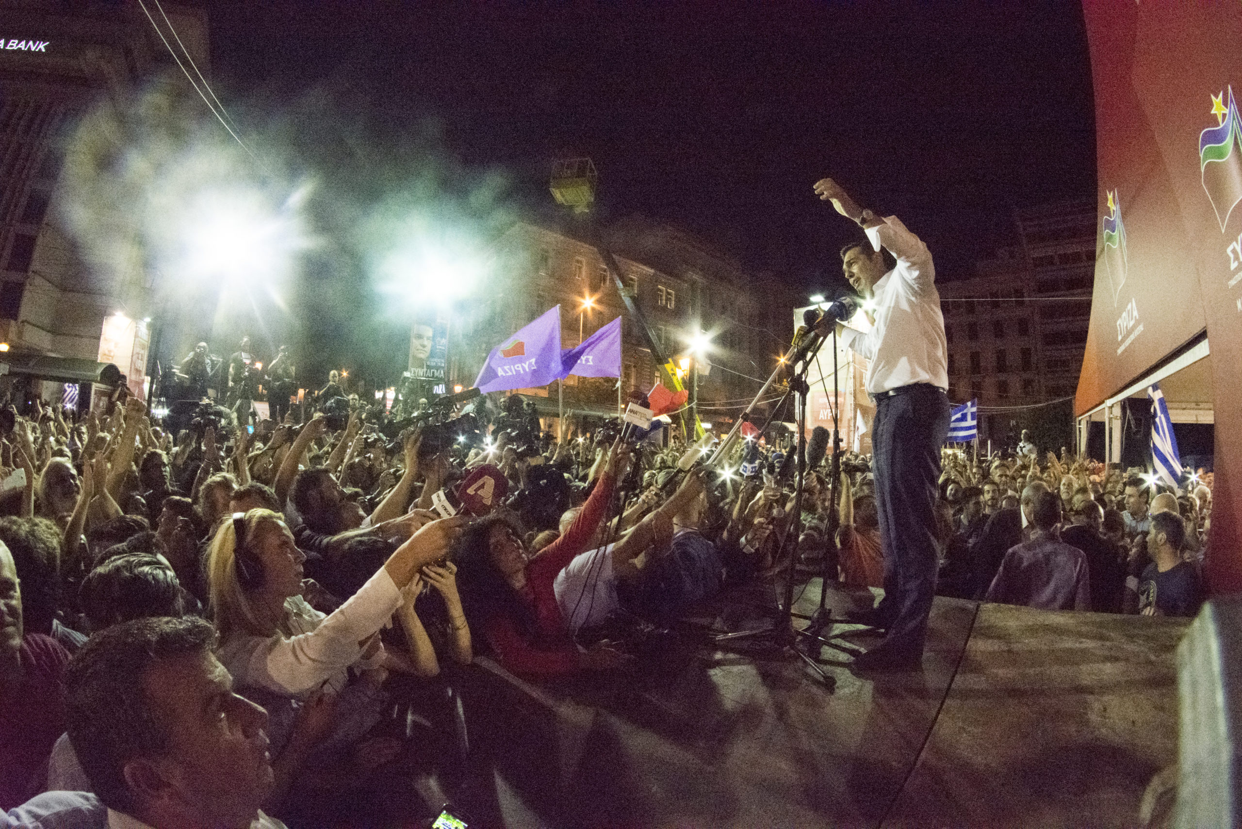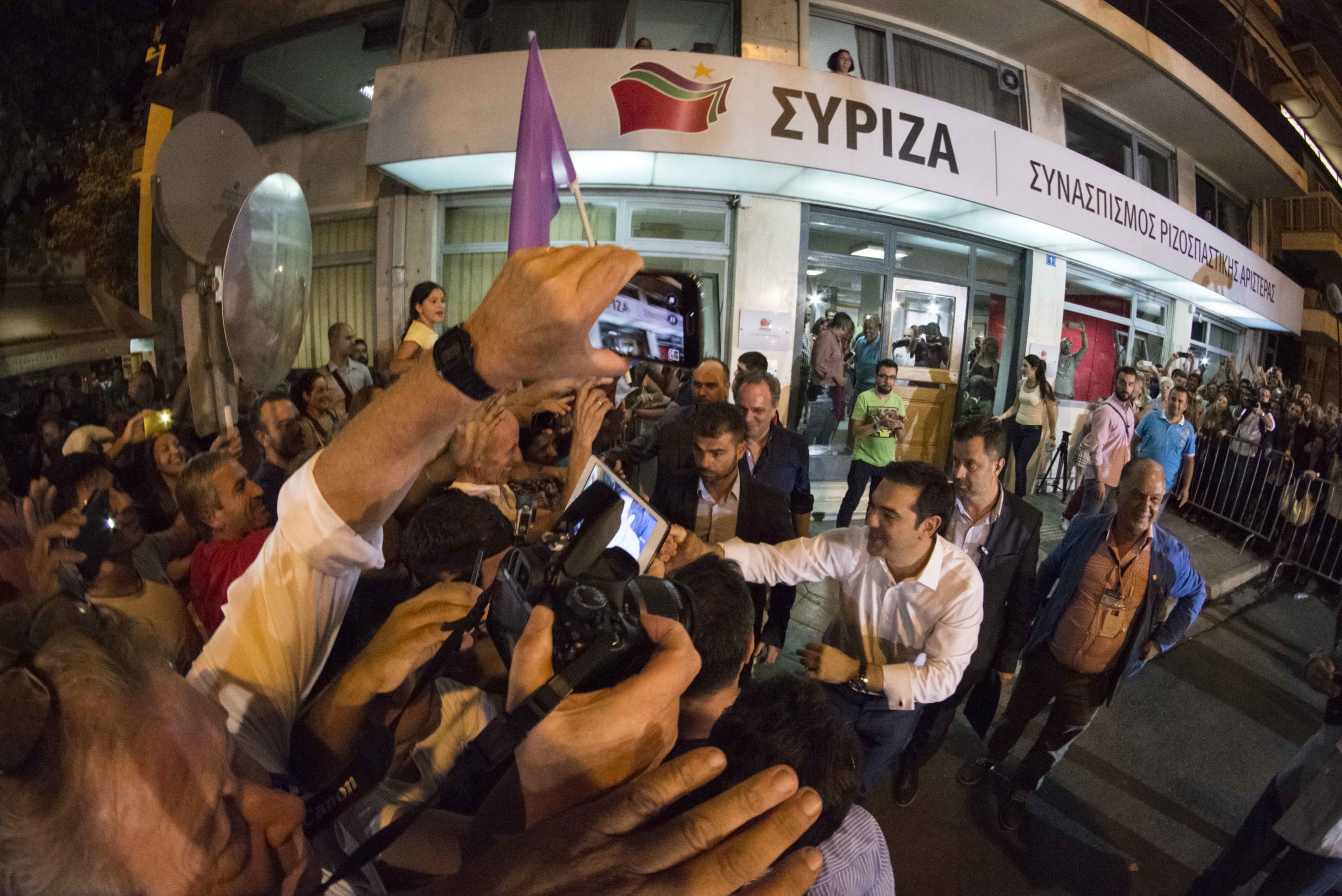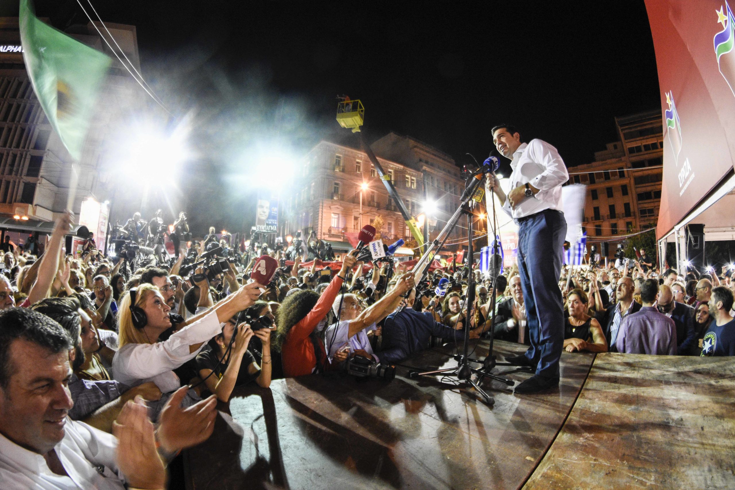 Ίδιο το σκηνικό στο προεκλογικό περίπτερο του ΣΥΡΙΖΑ στην πλατεία Κλαυθμώνος. Όταν έφτασε ο Αλέξης Τσίπρας επικράτησε πανικός. Οι πανηγυρισμοί κορυφώθηκαν όταν ο πρόεδρος του ΣΥΡΙΖΑ ανέβηκε στην εξέδρα για να κάνει δηλώσεις για τη νίκη στις εκλογές.