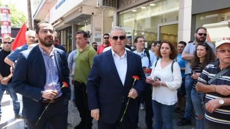 Τον υποδέχθηκαν στελέχη, μέλη και φίλοι του ΚΚΕ, ενώ ο κ. Κουτσούμπας μοιράζοντας τα κόκκινα γαρίφαλα που του πρόσφερε ένα μικρό κορίτσι, ευχήθηκε καλό κουράγιο και καλή δύναμη στους συντρόφους και τους φίλους του κόμματος, που δίνουν τη μάχη με τα κόκκινα ψηφοδέλτια στο χέρι.