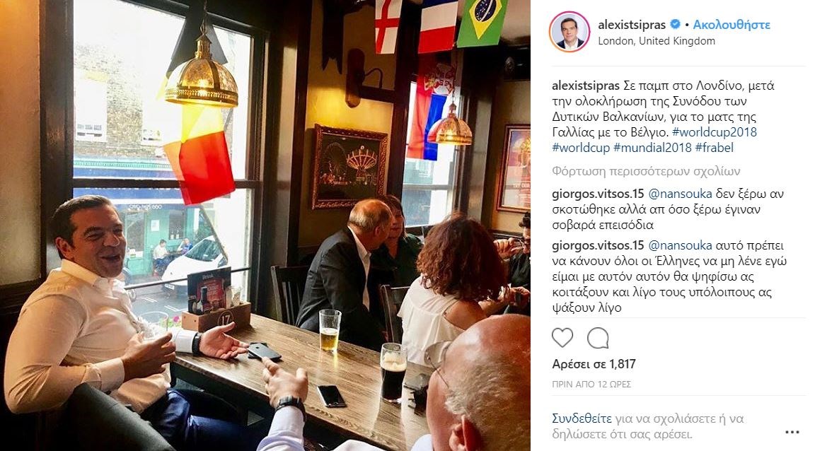 Ο Πρωθυπουργός Αλέξης Τσίπρας παρακολούθησε τον πρώτο ημιτελικό του Μουντιάλ ανάμεσα σε Γαλλία και Βέλγιο σε μία παμπ στο Λονδίνο, μετά την ολοκλήρωση της Συνόδου των Δυτικών Βαλκανίων.
