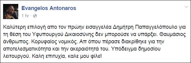 «Καλύτερη επιλογή από τον πρώην εισαγγελέα Δημήτρη Παπαγγελόπουλο για τη θέση του Υφυπουργού Δικαιοσύνης δεν μπορούσε να υπάρξει. Θαυμάσιος άνθρωπος. Κορυφαίος νομικός. Απ όπου πέρασε διακρίθηκε για την αποτελεσματικότητα και την ακεραιότητά του. Υπόδειγμα δημοσίου λειτουργού. Καλή επιτυχία, καλέ μου φίλε!», έγραψε ο κ. Αντώναρος.