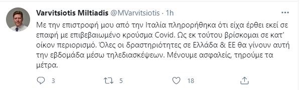 «Με την επιστροφή μου από την Ιταλία πληροφορήθηκα ότι είχα έρθει εκεί σε επαφή με επιβεβαιωμένο κρούσμα Covid», ανέφερε στην ανάρτησή του. «Ως εκ τούτου βρίσκομαι σε κατ’ οίκον περιορισμό. Όλες οι δραστηριότητες σε Ελλάδα και ΕΕ θα γίνουν αυτή την εβδομάδα μέσω τηλεδιασκέψεων. Μένουμε ασφαλείς, τηρούμε τα μέτρα», έγραψε ακόμη.