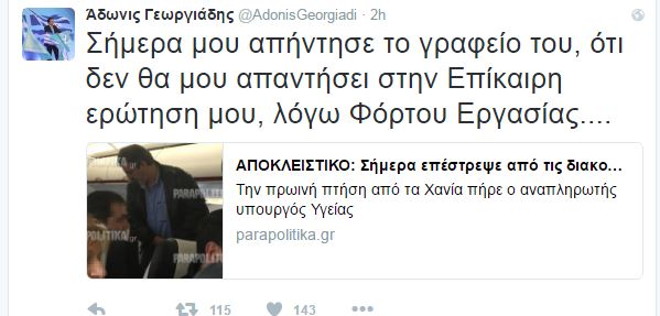 Την ίδια ώρα, o αντιπρόεδρος της ΝΔ Άδωνις Γεωργιάδης γράφει στο Twitter ότι ο κ. Πολάκης δεν θα απαντήσει σε ερώτηση που έχει καταθέσει λόγω φόρτου εργασίας.