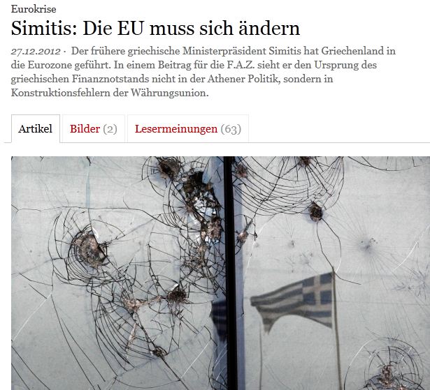 Η κρίση στην Ευρωζώνη εντοπίζεται στα δομικά λάθη της Ευρωπαϊκής Ένωσης και λιγότερο στην πολιτική της Ελλάδας, αναφέρει σε άρθρο του στη γερμανική εφημερίδα Frankfurter Allgemeine Zeitung (FAZ), ο πρώην πρωθυπουργός Κώστας Σημίτης.