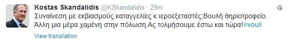 Τα όσα συνέβησαν το βράδυ της Δευτέρας στη Βουλή σχολίασε στον προσωπικό του λογαριασμό στο twitter, ο βουλευτής του ΠΑΣΟΚ, Κώστας Σκανδαλίδης.