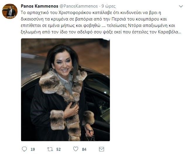“To αρπαχτικό του Χριστοφοράκου κατάλαβε ότι κινδυνεύει να βρει η δικαιοσύνη τα κρυμένα σε βαπόρια από την Περσία του κουμπάρου και επιτίθεται σε εμένα μήπως και φοβηθώ… τελείωσες Ντόρα απαξιωμένη και ξηλωμένη από τον ίδιο τον αδελφό σου ψάξε εκεί που έστειλες τον Καραβέλα…”