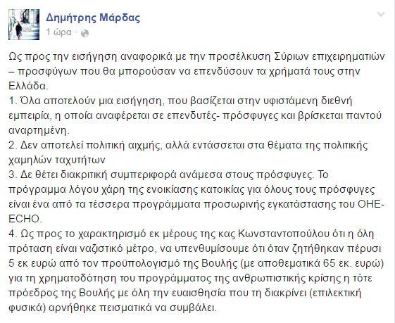 Με μία ανάρτηση στον προσωπικό του λογαριασμό στο Facebook απαντά ο υφυπουργός Εξωτερικών Δημήτρης Μάρδας, σε όσους έχουν ασκήσει κριτική σε όσα δήλωσε για επενδύσεις από τους πρόσφυγες, επισημαίνοντας ότι αποτελεί μία εισήγηση.
