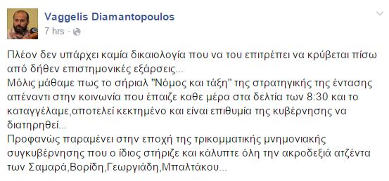 Σκληρή επίθεση εναντίον του Γιάννη Πανούση εξαπέλυσε μέσω Facebook ο Βαγγέλης Διαμαντόπουλος με αφορμή τη δήλωση του αναπληρωτή υπουργού Προστασίας του Πολίτη για το «κεκτημένο Δένδια στο κέντρο της Αθήνας».