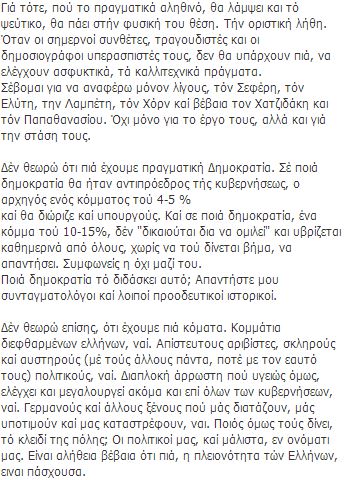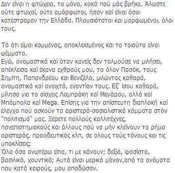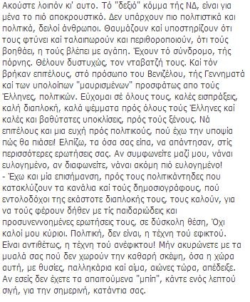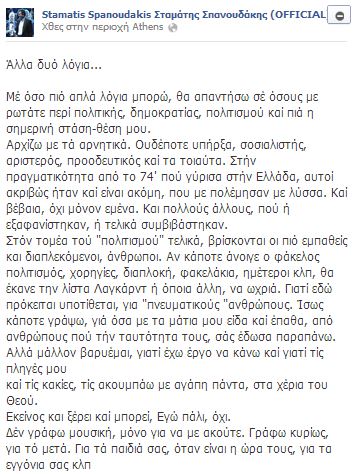Ο μουσικοσυνθέτης με ανάρτηση του στο Facebook τοποθετείται σχετικά με τις πολιτικές εξελίξεις και δηλώνει απογοητευμένος από την κυβέρνηση χρησιμοποιώντας σκληρούς χαρακτηρισμούς για τους πολιτικούς αρχηγούς. Όπως χαρακτηριστικά αναφέρει, “η κυβέρνηση πάσχει από το σύνδρομο της πόρνης”.