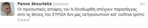 “Οι προσωπικές απόψεις του Ν.Θεοδωρίδη απέχουν παρασάγγας από τις θέσεις του ΣΥΡΙΖΑ δεν μας εκπροσωπούν κατ’ ουδένα τρόπο”, έγραψε ο εκπρόσωπος Τύπου της αξιωματικής αντιπολίτευσης στο Twitter.