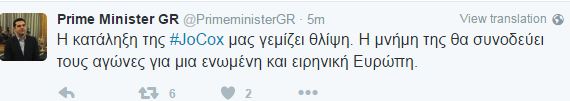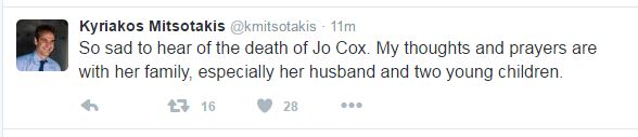H δολοφονία της βουλευτή του Εργατικού Κόμματος Τζο Κοξ είναι σοκαριστική. Το μίσος και ο εθνικισμός είναι κοινοί εχθροί των λαών μας», έγραψε χαρακτηριστικά ο Έλληνας πρωθυπουργός στον προσωπικό του λογαριασμό Twitter.