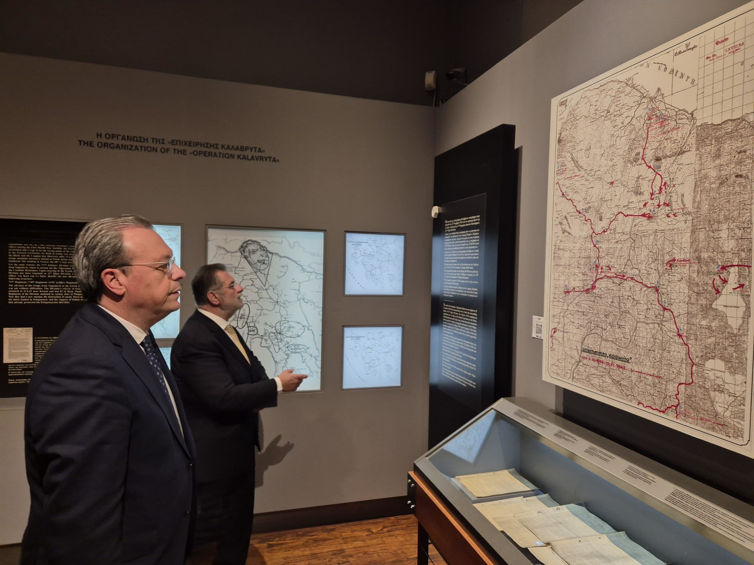 Στη συνέχεια, επισκέφθηκε την έκθεση μνήμης δίπλα από το μνημείο των εκτελεσθέντων, τη Φωτογραφική έκθεση του Θεοφάνη Παπαγεωργίου στο ιστορικό Νεκροταφείο Καλαβρύτων και το Μουσείο Καλαβρυτινού Ολοκαυτώματος.