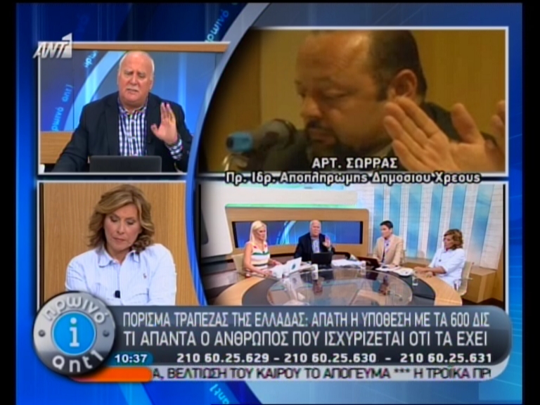 «Τα 600 δισ. υπάρχουν, το έχω αποδείξει» λέει αυτή την ώρα ο Αρτέμιος Σώρρας, ο επικεφαλής της END, που φέρεται να διαθέτει το ιλιγγιώδες αυτό ποσό που θα εξαγοράσει το χρέος της χώρας μας.Ο κ. Σώρρας αντικρούει την Τράπεζα της Ελλάδας, αλλά και την τράπεζα του Μόντρεαλ, οι οποίες έχουν πάρει θέση κατά του κ. Σώρρα και έχουν αρνηθεί την ύπαρξη των 600 δισ. δολαρίων.Ενταση μεταξύ του κ. Σώρρα, του κ. Παπαδάκη και της Μαριάννας Πυργιώτη.