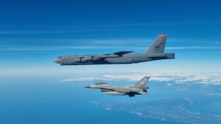 Συνολικά 4 ελληνικά F-16 συνόδευαν, χθες Τετάρτη 22 Μαρτίου, το θηριώδες αμερικανικό βομβαρδιστικό Β-52 της Bomber Task Force της Πολεμικής Αεροπορίας των ΗΠΑ στο πλαίσιο της άσκησης Spartan Spear, σε σενάριο εικονικής προσβολή στόχων με την επίγεια συνδρομή από την 32 Ταξιαρχία Πεζοναυτών.