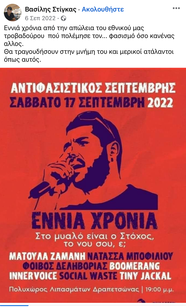 “Εννέα χρόνια από την απώλεια του εθνικού μας τροβαδούρου που πολέμησε τον φασισμό όσο κανένας άλλος. Θα τραγουδήσουν στην μνήμη του και μερικοί ατάλαντοι όπως αυτός”, ήταν μία από τις αναρτήσεις του κατά του Παύλου Φύσσα.
