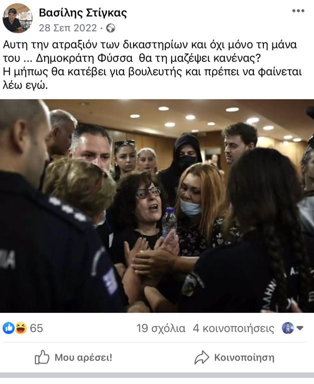 “Αυτή την ατραξιόν των δικαστηρίων και όχι μόνο τη μάνα του… Δημοκράτη Φύσσα θα τη μαζέψει κανένας; Ή μήπως θα κατέβει για βουλευτής και πρέπει να φαίνεται, λέω εγώ”, είχε γράψει τον Σεπτέμβριο του 2022.