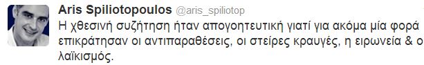 “Η χθεσινή συζήτηση ήταν απογοητευτική γιατί για ακόμα μία φορά επικράτησαν οι αντιπαραθέσεις, οι στείρες κραυγές, η ειρωνεία και ο λαϊκισμός”, έγραψε ο Άρης Σπηλιωτόπουλος.