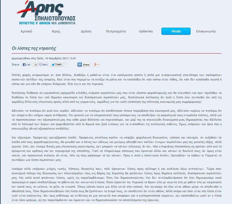 «Αδύνατον να πιστέψω ότι αυτό έχει συμβεί» γράφει στο προσωπικό του blog ο βουλευτής της ΝΔ, Άρης Σπηλιωτόπουλος αναφερόμενος σε δημοσίευμα της κυριακάτικης εφημερίδας «Πρώτο Θέμα» που με τίτλο «1.600 πλούσιοι καλούνται να δικαιολογήσουν ακίνητα-καταθέσεις» δημοσίευσε λίστα με ονόματα καταθετών. Ο κύριος Σπηλιωτόπουλος στο άρθρο του επισημαίνει ότι η λίστα δεν συντάχθηκε από τις Ελληνικές ελεγκτικές αρχές αλλά από τις γερμανικές. Και το άρθρο του καταλήγει: «Δεν χρειαζόμαστε λίστες ντροπής. Λίστες Schindler χρειαζόμαστε που να είμαστε όλοι μέσα για να σωθούμε και μαζί η Ελληνικότητα της δημοκρατίας μας».