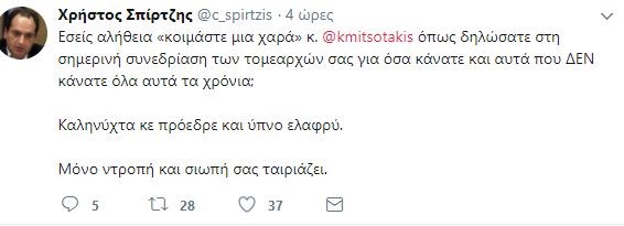 «Εσείς αλήθεια «κοιμάστε μια χαρά» κ. @kmitsotakis όπως δηλώσατε στη σημερινή συνεδρίαση των τομεαρχών σας για όσα κάνατε και αυτά που ΔΕΝ κάνατε όλα αυτά τα χρόνια; Καληνύχτα κε πρόεδρε και ύπνο ελαφρύ. Μόνο ντροπή και σιωπή σας ταιριάζει», έγραψε στο Twitter ο κ. Σπίρτζης.