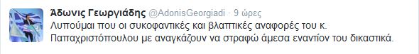 Μάλιστα, μέσω Twitter, ο κ. Γεωργιάδης σημείωσε: «Λυπούμαι που οι συκοφαντικές και βλαπτικές αναφορές του κ. Παπαχριστόπουλου με αναγκάζουν να στραφώ άμεσα εναντίον του δικαστικά.»