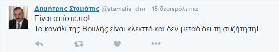 Στη συνέχεια ο κ. Σταμάτης  με τρίτη ανάρτηση του αναφέρει ότι «το κανάλι της Βουλής είναι κλειστό και δεν μεταδίδει τη συζήτηση».