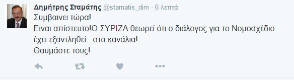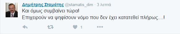 «Ο ΣΥΡΙΖΑ θεωρεί ότι ο διάλογος για το Νομοσχέδιο έχει εξαντληθεί στα κανάλια. Θαυμάστε τους», έγραψε στον προσωπικό του λογαριασμό στο Twitter ο βουλευτής της Νέας Δημοκρατίας Δημήτρης Σταμάτης ενώ με δεύτερη ανάρτηση του συμπλήρωσε: «Επιχειρούν να ψηφίσουν νόμο που δεν έχει κατατεθεί πλήρως».