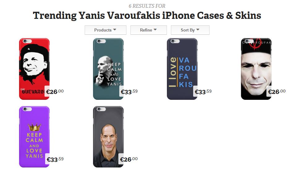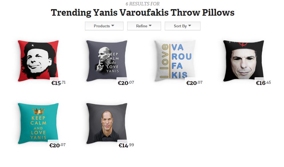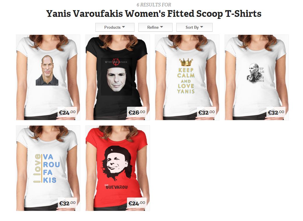 Κούπες, T-shirts, φούστες, τσάντες, ακόμη και φορμάκια για μωρά με το πρόσωπο του πρώην υπουργού Οικονομικών Γιάνη Βαρουφάκη κάνουν θραύση στο διαδίκτυο.