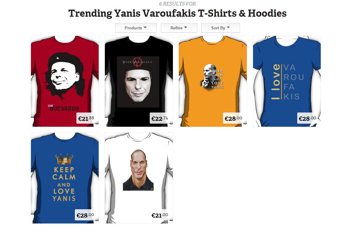 Μια εταιρεία από την Αυστραλία, η “Redbubble”, έχει φτιάξει ολόκληρη σειρά με τίτλο “I love Yianis Varoufakis” και έχει τυπώσει το πρόσωπό του στα προϊόντα της, τα οποία έχουν γίνει ανάρπαστα.