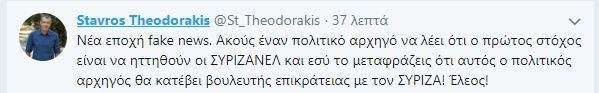 «Νέα εποχή fake news. Ακούς έναν πολιτικό αρχηγό να λέει ότι ο πρώτος στόχος είναι να ηττηθούν οι ΣΥΡΙΖΑΝΕΛ και εσύ το μεταφράζεις ότι αυτός ο πολιτικός αρχηγός θα κατέβει βουλευτής επικράτειας με τον ΣΥΡΙΖΑ! Έλεος!» έγραψε στο Twitter ο κ. Θεοδωράκης.