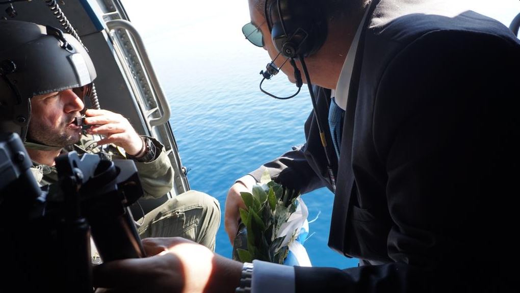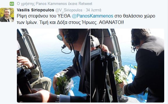 Ο υπουργός Εθνικής Άμυνας, Πάνος Καμμένος, πέταξε πάνω από την βραχονησίδα των Ιμίων και έριξε από ελικόπτερο στεφάνι στη μνήμη των θυμάτων των Ιμίων.