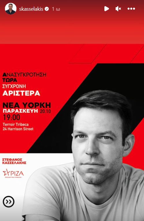 Συγκεκριμένα, ο κ. Κασσελάκης ενημερώνει μέσω Instagram ότι αύριο Παρασκευή, μία ημέρα μετά τον γάμο του, θα πραγματοποιήσει συγκέντρωση στη Νέα Υόρκη στις 19:00 στο Terroir Tribeca.