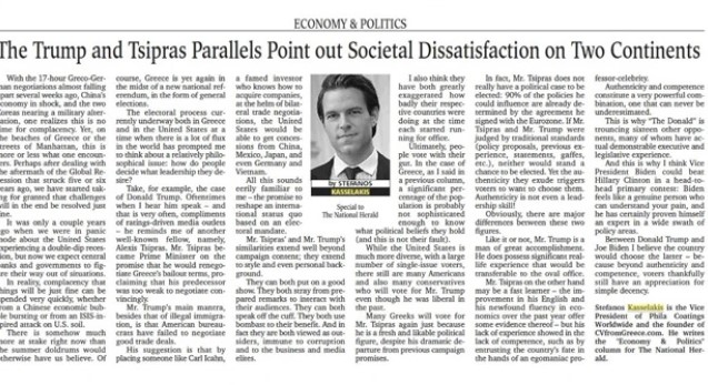 Σε άλλο σημείο είχε γράψει πως «αν ο κ. Τσίπρας και ο κ. Τραμπ κρίνονταν με βάση παραδοσιακά κριτήρια (πολιτικές προτάσεις, προηγούμενη εμπειρία, δηλώσεις, γκάφες κλπ.), κανένας από τους δύο δεν θα είχε την παραμικρή ελπίδα να εκλεγεί».