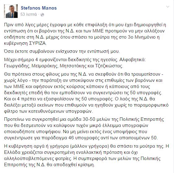 Την κατάσταση στο εσωτερικό της Νέας Δημοκρατίας με αφορμή την κούρσα της διαδοχής, για την ηγεσία του κόμματος, σχολίασε ο Στέφανος Μάνος, με ανάρτηση που έκανε στον προσωπικό του λογαριασμό στο Facebook. Συγκεκριμένα, ο κ. Στέφανος έγραψε: