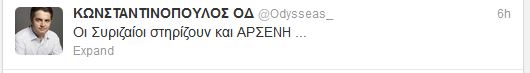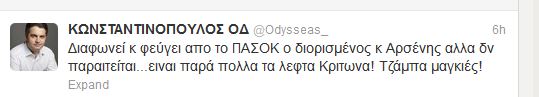 “Διαφωνεί και φεύγει απο το ΠΑΣΟΚ ο διορισμένος κ. Αρσένης αλλά δεν παραιτείται…είναι παρά πολλά τα λεφτά Κρίτωνα! Τζάμπα μαγκιές!” έγραψε ο βουλευτής του ΠΑΣΟΚ Οδυσσέας Κωνσταντινόπουλος και λίγο αργότερα συνέχισε: “Οι Συριζαίοι στηρίζουν και ΑΡΣΕΝΗ …”