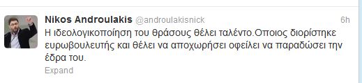 “Η ιδεολογικοποίηση του θράσους θέλει ταλέντο.Όποιος διορίστηκε ευρωβουλευτής και θέλει να αποχωρήσει οφείλει να παραδώσει την έδρα του”, έγραψε στο Twitter.