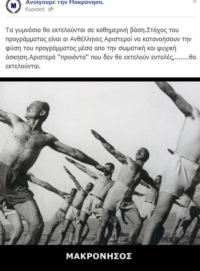 «Τα γυμνάσια θα εκτελούνται σε καθημερινή βάση. Στόχος του προγράμματος είναι οι Ανθέλληνες Αριστεροί να κατανοήσουν την φύση του προγράμματος μέσα από την σωματική και ψυχική άσκηση. Αριστερά ”προϊόντα” που δεν θα εκτελούν εντολές…θα εκτελούνται», είναι το σχόλιο που συνοδεύει την συγκεκριμένη ανάρτηση.