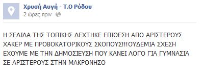Πριν από λίγο, ωστόσο, οι διαχειριστές της σελίδας της Τοπικής Οργάνωσης της Χρυσής Αυγής στην Ρόδο με ανάρτησή του υποστηρίζουν ότι «η σελίδα τους δέχθηκε επίθεση από αριστερούς χάκερ με προβοκατόρικους σκοπούς. Ουδεμία σχέση έχουμε με τη δημοσίευση που κάνει λόγο για γυμνάσια σε αριστερούς στην Μακρόνησο».