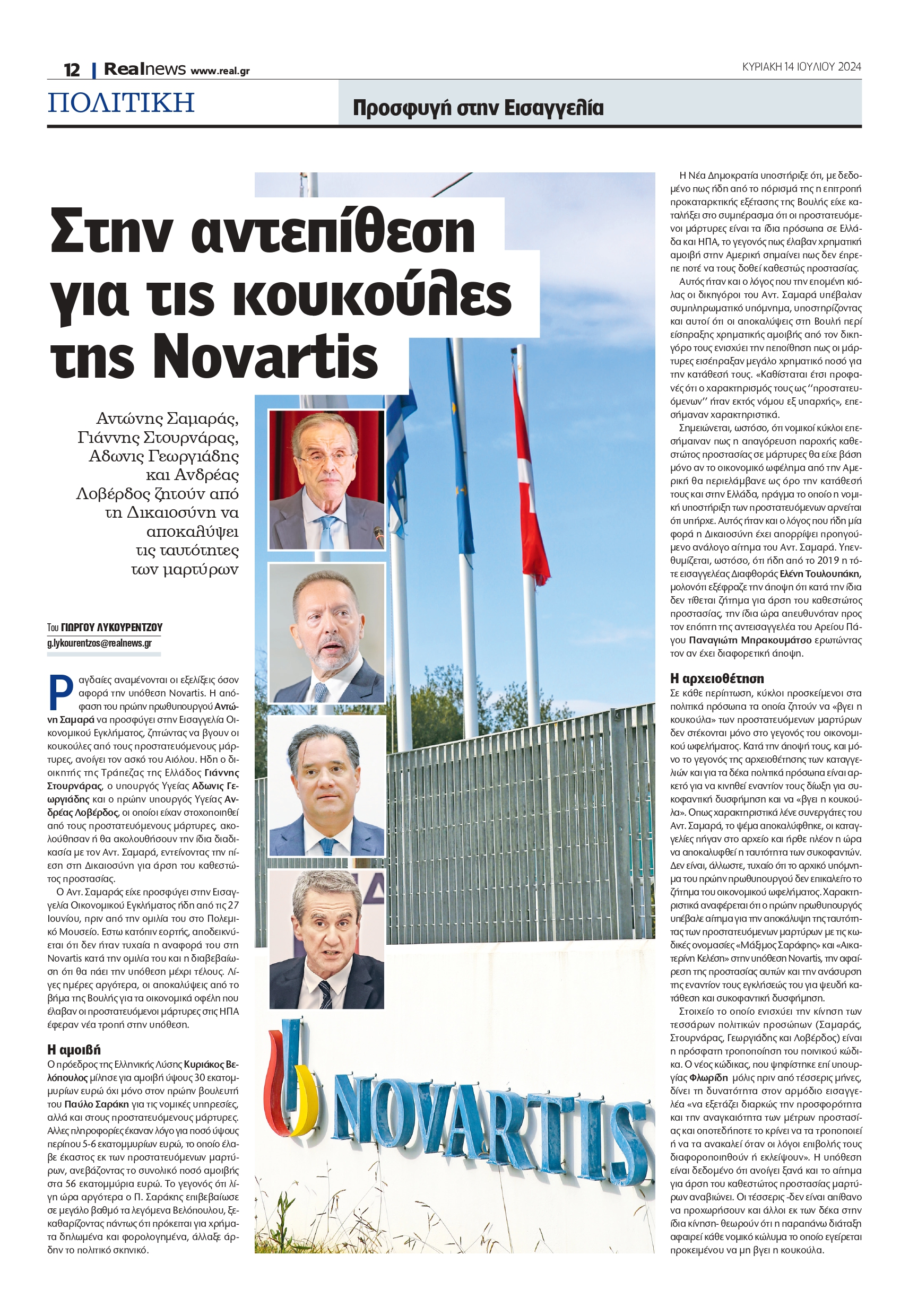 Ο Αντ. Σαμαράς είχε προσφύγει στην Εισαγγελία Οικονομικού Εγκλήματος ήδη από τις 27 Ιουνίου, πριν από την ομιλία του στο Πολεμικό Μουσείο. Έστω κατόπιν εορτής, αποδεικνύεται ότι δεν ήταν τυχαία η αναφορά του στη Novartis κατά την ομιλία του και η διαβεβαίωση ότι θα πάει την υπόθεση μέχρι τέλους. Λίγες ημέρες αργότερα, οι αποκαλύψεις από το βήμα της Βουλής για τα οικονομικά οφέλη που έλαβαν οι προστατευόμενοι μάρτυρες στις ΗΠΑ έφεραν νέα τροπή στην υπόθεση.