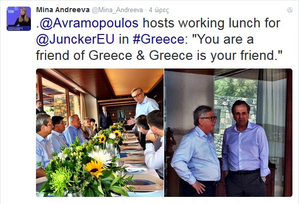 Όπως γνωστοποίησε με μία σχετική ανάρτηση στο Twitter η εκπρόσωπος του προέδρου της Κομισιόν, Μίνα Αντρέεβα, ο κ. Δημήτρης Αβραμόπουλος είπε στον Ζαν Κλοντ Γιούνκερ: «Είσαι φίλος της Ελλάδας και η Ελλάδα είναι φίλη σου».