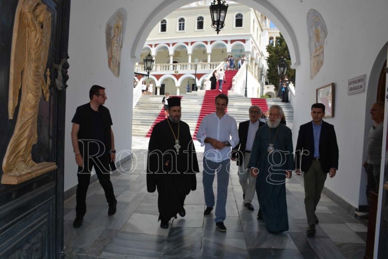 Στη Θεία Λείτουργία της εορτής της Πεντηκοστής και τον Εσπερινό της Γονυκλισίας παρέστη σήμερα, ο Πρωθυπουργός Κυριάκος Μητσοτάκης στον Πανίερο Ναό Ευαγγελιστρίας της Τήνου. Ο Πρωθυπουργός κατά την είσοδό του στον Πανίερο Ναό της Ευαγγελιστρίας ασπάστηκε την Θαυματουργή Εικόνα της Παναγίας, καθώς και την Εικόνα των Αγίων Κωνσταντίνου και Ελένης την οποία είχε προσφέρει ο πατέρας του, Κωνσταντίνος Μητσοτάκης.