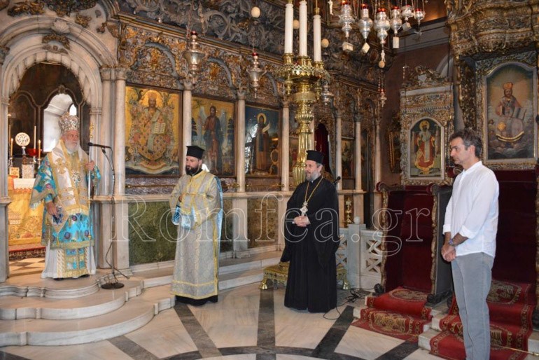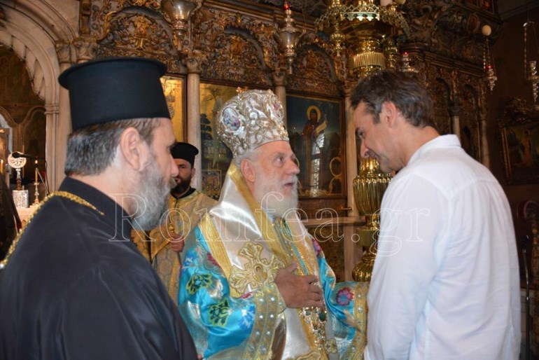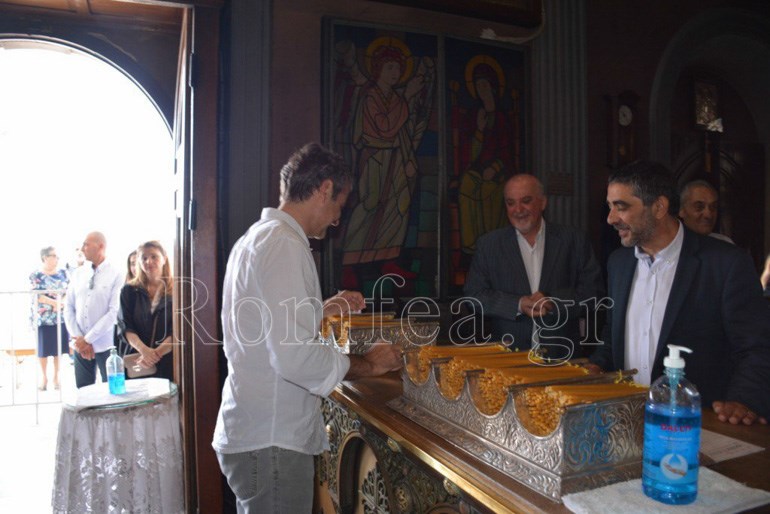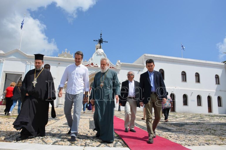 “Σας παρακαλώ κ. Πρόεδρε να προσκυνήσετε την Eικόνα (Αγίων Κωνσταντίνου και Ελένης), την οποία αφιέρωσε στο Ναό της Παναγίας ο πατέρα σας και προσωπικός μου ευεργέτης Κωνσταντίνος Μητσοτάκης”, ανέφερε χαρακτηριστικά ο Μητροπολίτης Σύρου Δωρόθεος.