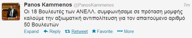 «Οι 18 Βουλευτές των ΑΝΕΛΛ. συμφωνήσαμε σε πρόταση μομφής καλούμε την αξιωματική αντιπολίτευση για τον απαιτούμενο αριθμό 50 βουλευτών», έγραψε χαρακτηριστικά στον προσωπικό του λογαριασμό στο twitter, o Πάνος Καμμένος.