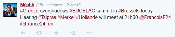 Όπως αναφέρει Ιρλανδή δημοσιογράφος Méabh Mc Mahon στο Twitter, η Ελλάδα επισκιάζει τη 2η Σύνοδο της EU-CELAC σήμερα. Η συνάντηση Τσίπρα – Μέρκελ – Ολάντ θα γίνει στις 21:00 (ώρα Βρυξελλών).