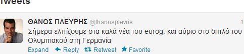 Όλα τα βλέμματα είναι στραμμένα στο Eurogroup, που βρίσκεται σε εξέλιξη στις Βρυξέλλες. Είναι λογικό να υπάρχει αγωνία για τις αποφάσεις που θα παρθούν για την χώρα μας. Ο Θάνος Πλεύρης εξέφρασε την ελπίδα πριν από λίγο στο Twitter να πάνε όλα καλά σήμερα για την Ελλάδα και αύριο για τον Ολυμπιακό, ο οποίος αντιμετωπίζει την Σάλκε για το τσάμπιονς λιγκ.