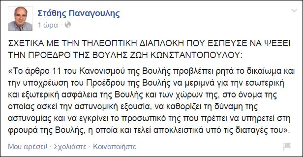 Για “τηλεοπτική διαπλοκή που έσπευσε να ψέξει την πρόεδρο της βουλής” κάνει λόγο ο Στάθης Παναγούλης, υπερασπιζόμενος την Ζωή Κωνσταντοπούλου σε ότι αφορά το περιστατικό με τον αξιωματικό της ΕΛ.ΑΣ.