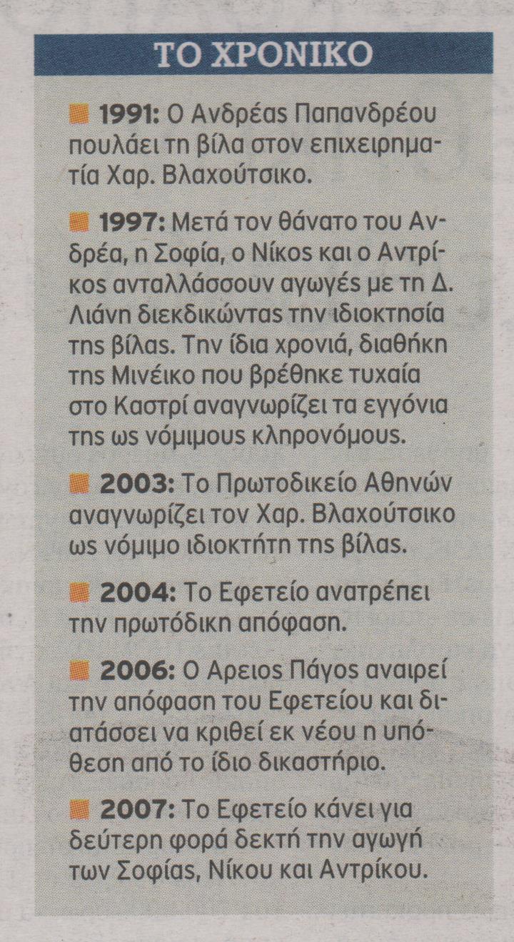 Σελίδες της νεότερης ιστορίας γράφτηκαν μέσα στο σπίτι του Παλαιού Ψυχικού που φιλοξένησε τρεις γενιές Παπανδρέου. Η ιδιοκτησία του πέρασε από χίλια –δικαστικά-κύματα μέχρι να κατοχυρωθεί, μόλις το 2007., στα 4 εγγόνια της συζύγου του «Γέρου της Δημοκρατίας».