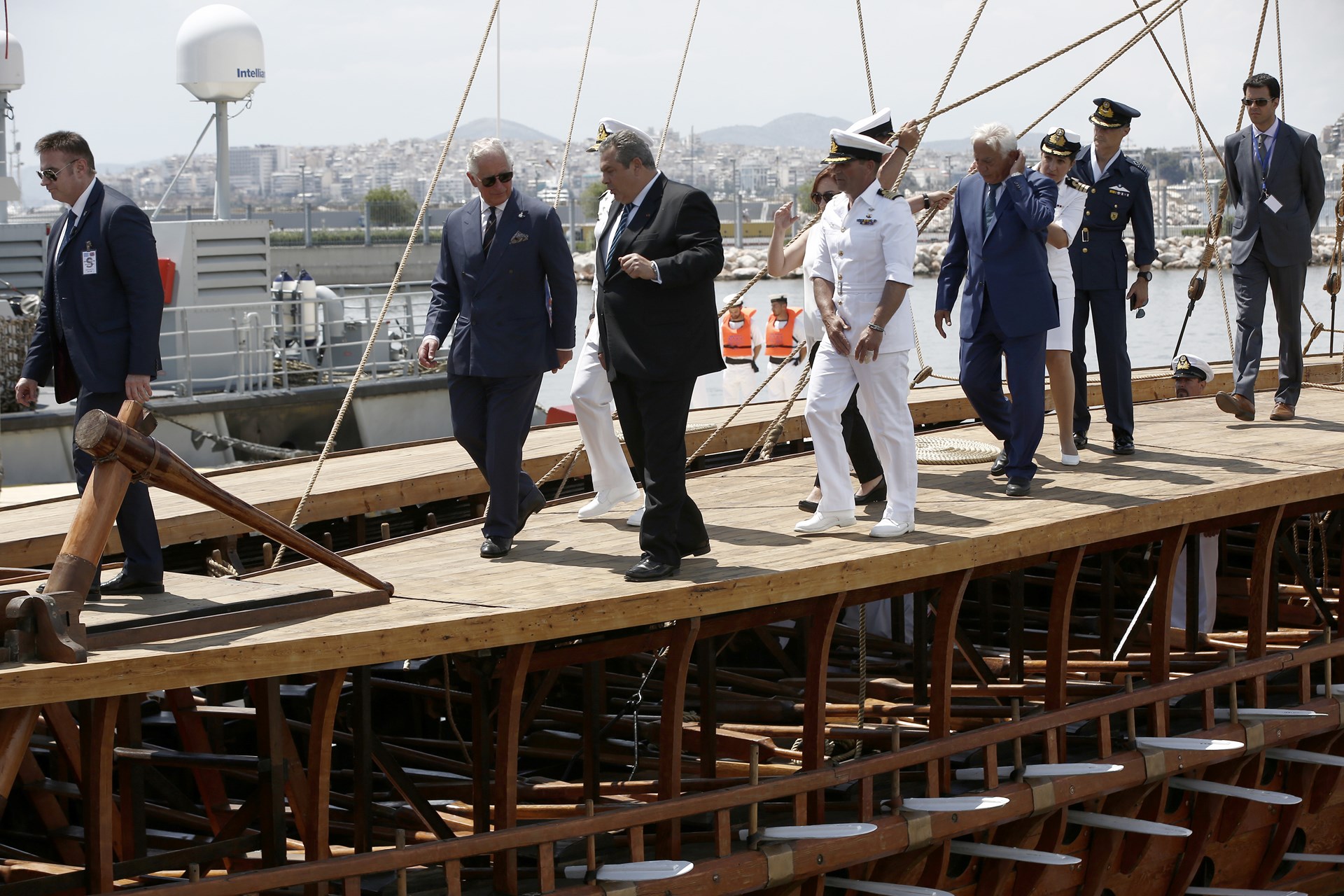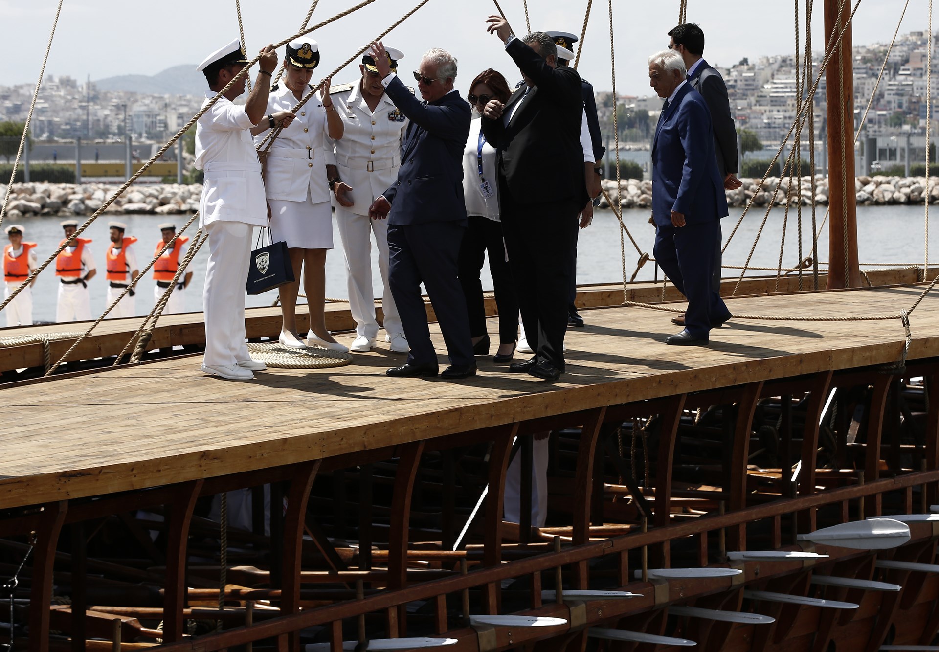 Ο Κάρολος ξεναγήθηκε και στην τριήρη “Ολυμπιάς” του Ελληνικού Πολεμικού Ναυτικού ενώ παρακολούθησε την τιμητική πτήση ενός ελληνικού Mirage στην μνήμη του ήρωα πιλότου Γιώργου Μπαλταδώρου καθώς και την επίδειξη 9 Βρετανικών Red Arrows.