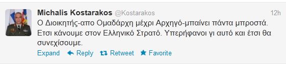 «Ο Διοικητής-από Ομαδάρχη μέχρι Αρχηγό-μπαίνει πάντα μπροστά. Έτσι κάνουμε στον Ελληνικό Στρατό. Υπερήφανοι γι αυτό και έτσι θα συνεχίσουμε», γράφει ο Μιχάλης Κωσταράκος υποστηρίζοντας, την απόφασή του να κατέβει στον προαύλιο χώρο του Πενταγώνου κατά τη διάρκεια των επεισοδίων από τους εργαζόμενους στα Ναυπηγεία Σκαραμαγκά.Ο Αρχηγός του Γενικού Επιτελείου Εθνικής Άμυνας απαντά με αυτό τον τρόπο, μέσω του προσωπικού λογαριασμού του στο Twitter, σε όσους τον κατηγόρησαν για την επιλογή του αυτή.